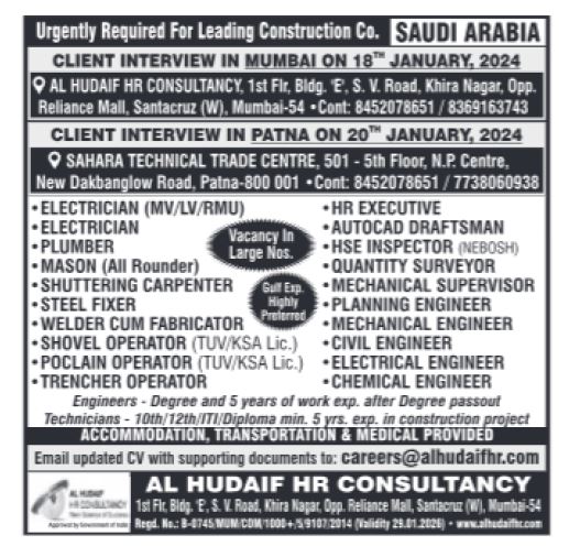 Abroad Jobs Interviews Posted In The Assignment Abroad Times Gulf Openings Online Paper, Wednesday, 10 January 2024.