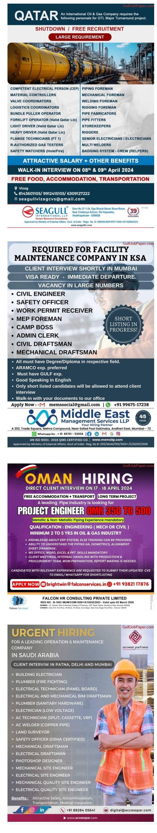 Find Interviews For Gulf Jobs Through CV Selection And Walk-in Interviews, In The Newspaper From Today Through 08 April, 2024.